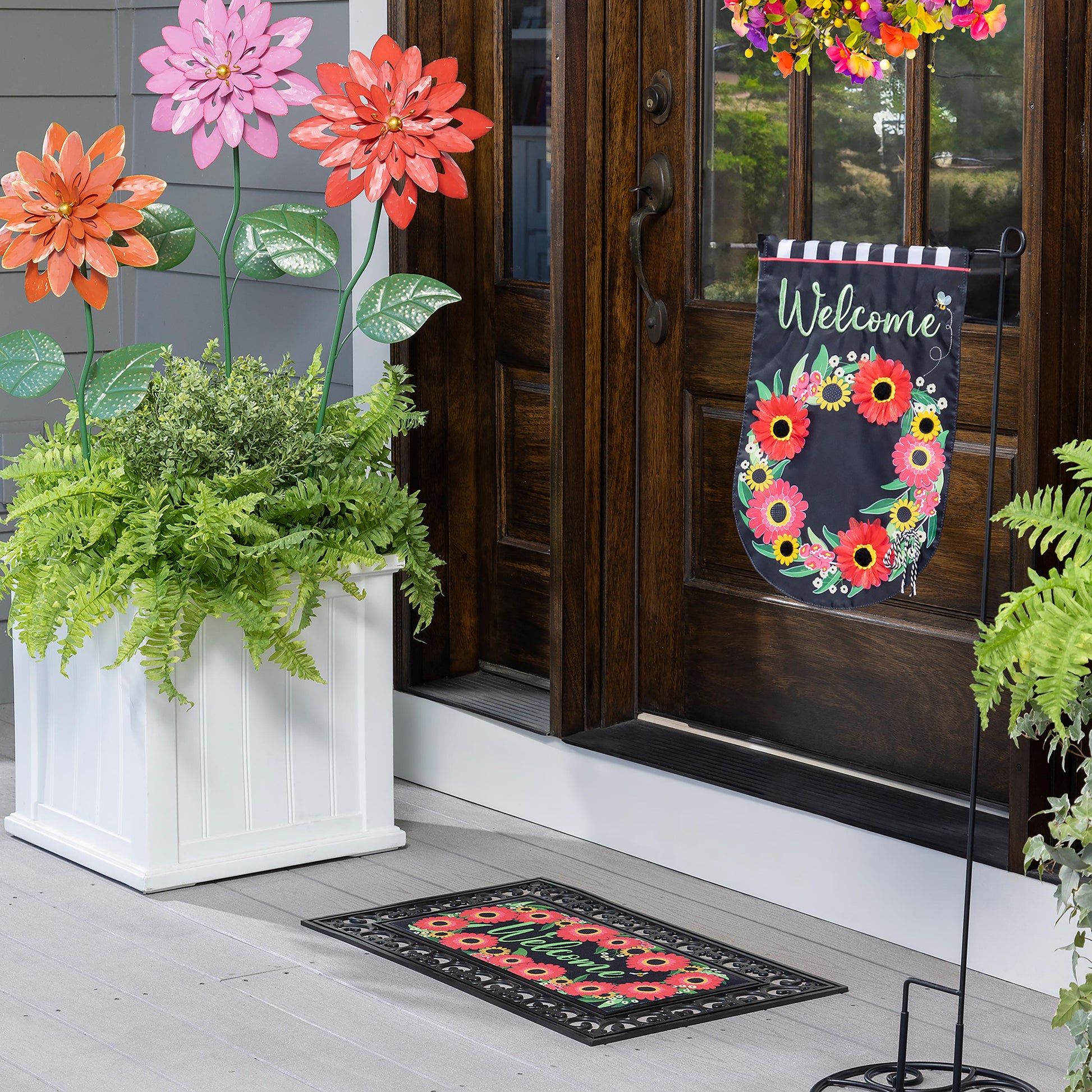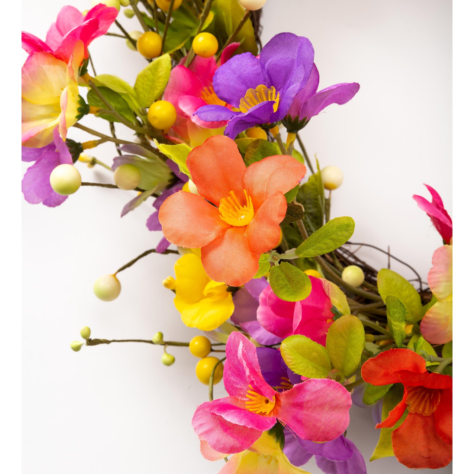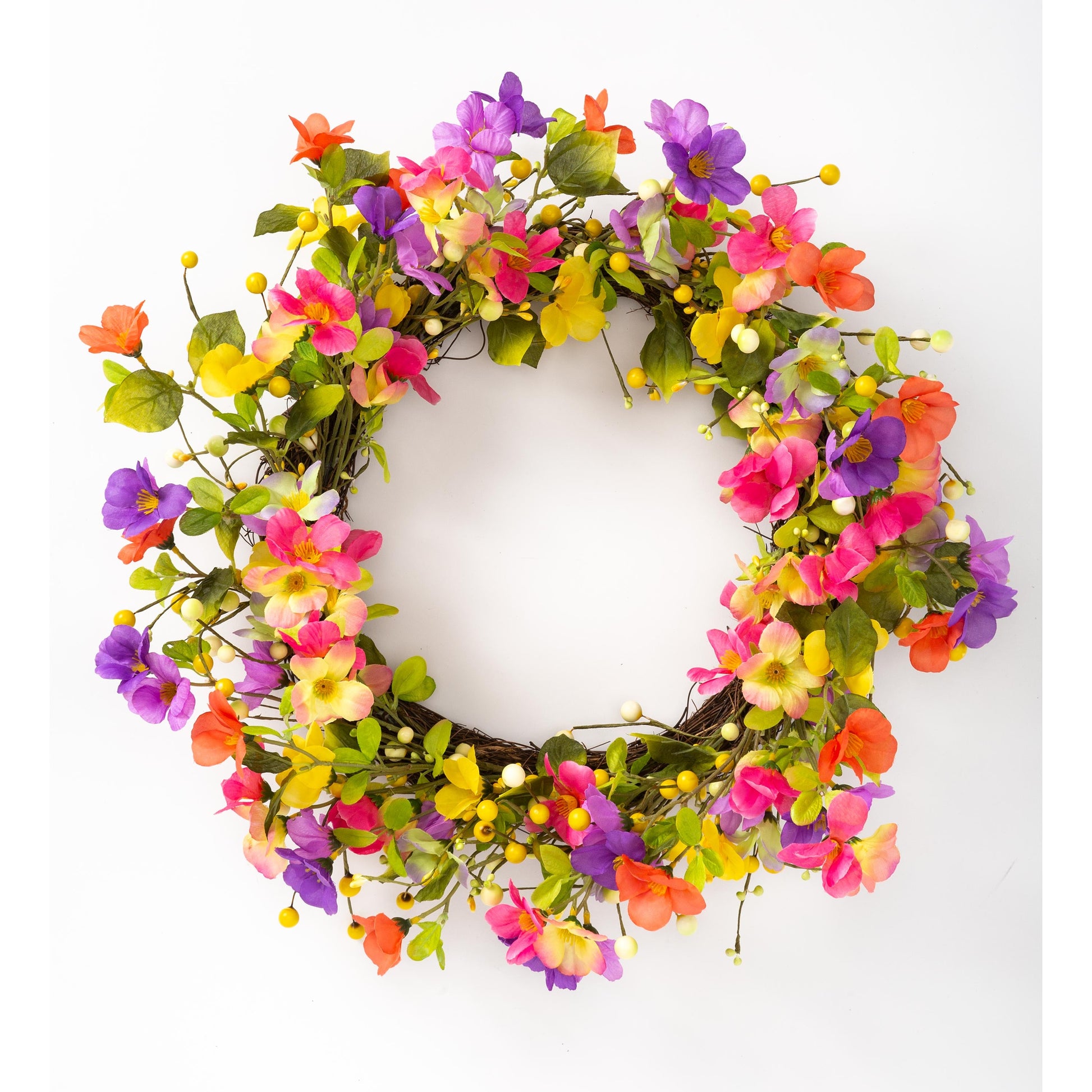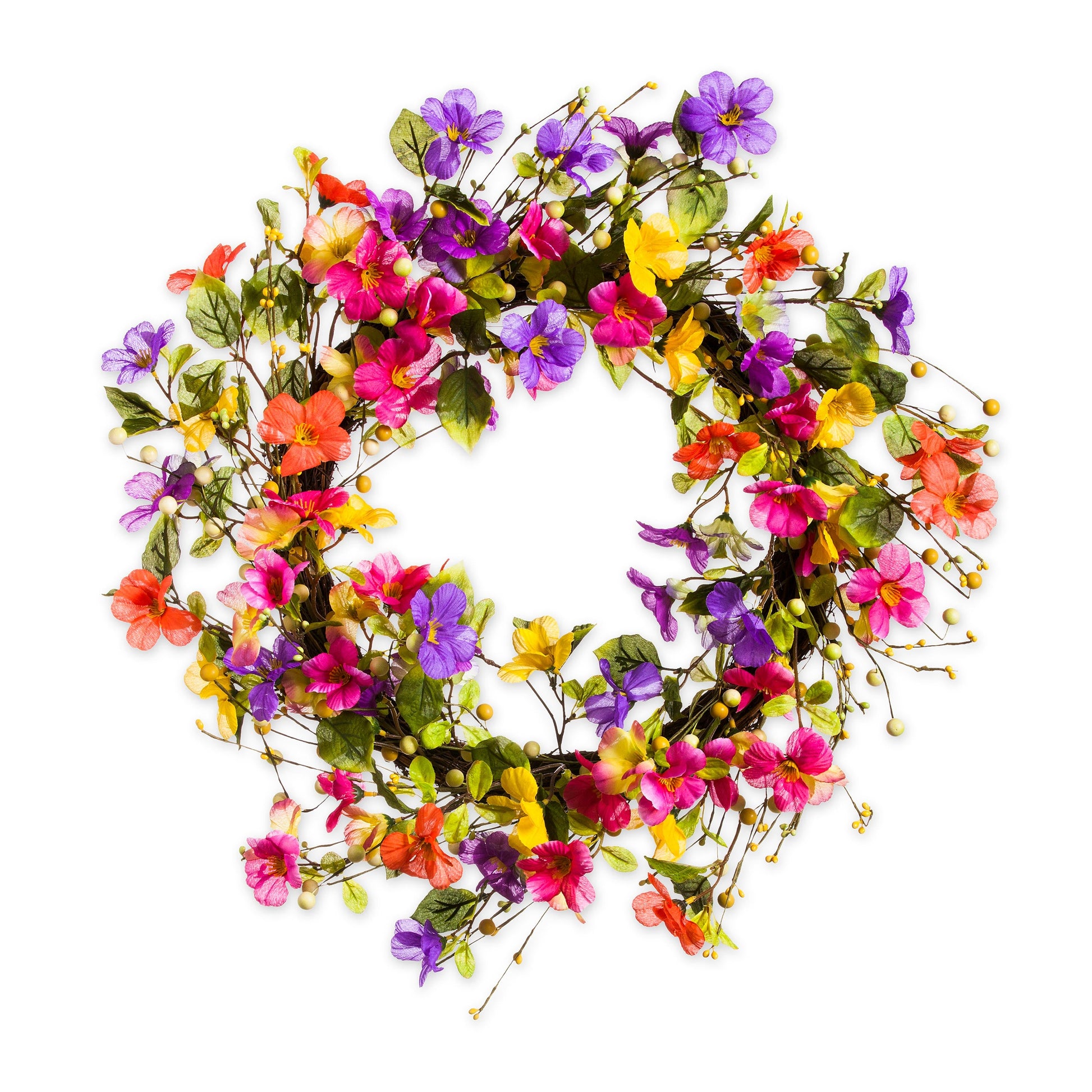 Hang this Floral Watercolor Wreath on your front door as a sunny welcome to visitors. You'll love the happy look it brings to your home, indoors or out. Faux flowers on a twig base brighten any space with an array of colorful pansies and violets. Shades of pink, purple and yellow add a cheerful touch to any door or wall. It's a fresh, happy accent for any space from bedroom to kitchen, front door to hallway. Use indoors or outside in a protected area (covered porch is okay); for longest life, do not expose directly to the elements. Imported.