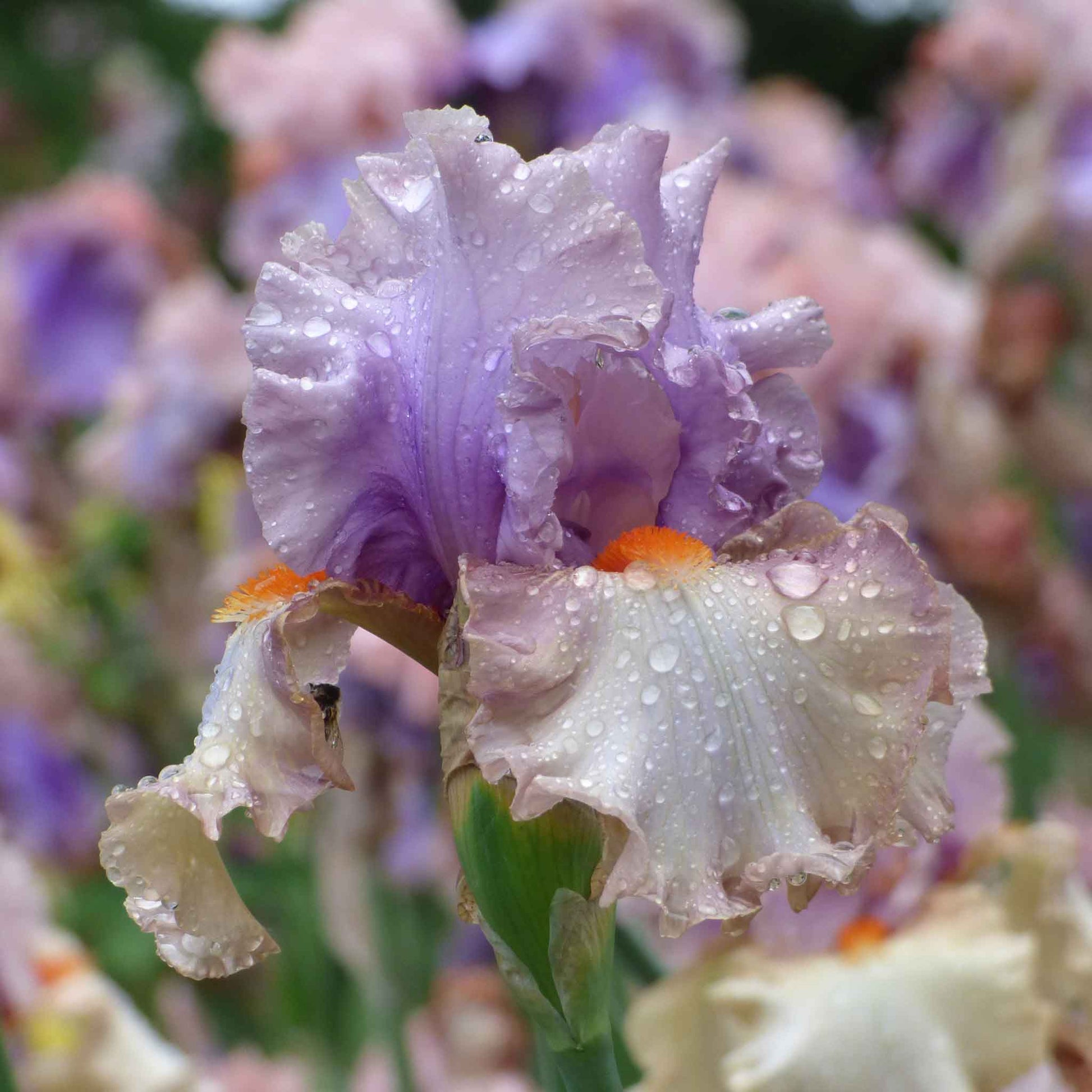 Enraptured Bearded Iris - a true showstopper! Who knew that shades of lavender, orange, and pale apricot could blend together so gently, so beautifully? Lavender standards spill down into the falls with just a blush over the buff-colored falls. Highlighting the harmonious hues are the alluring orange beards. Enraptured presents expansive blooms on handsomely branched stems, boasting an impressive count of 8 buds per stalk.