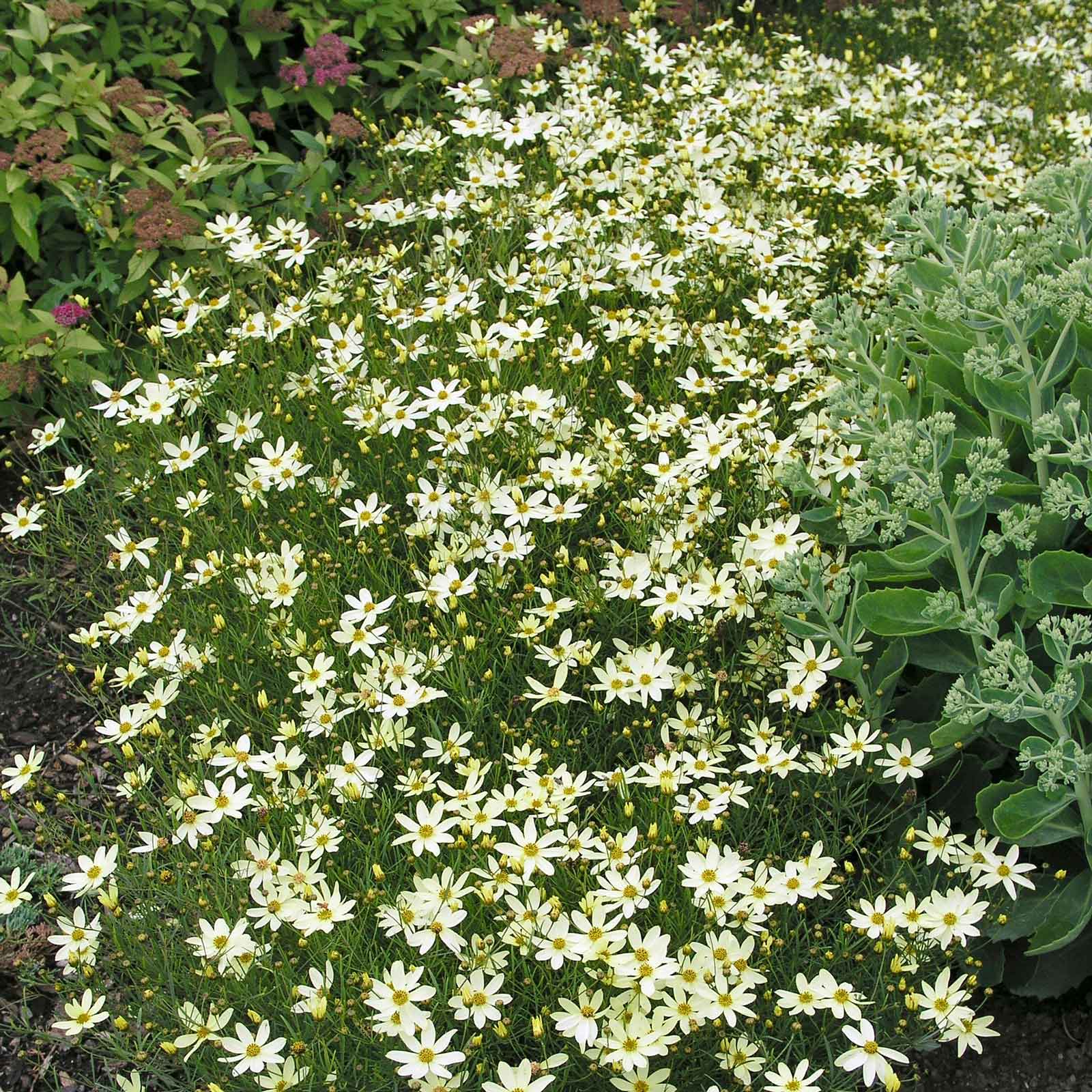 Among Coreopsis verticillata, moonbeam truly stands out. The soft, pale-yellow flowers of Coreopsis Roots Moonbeam bloom abundantly above delicate, needlelike foliage, complementing nearly every color combination in existence. It flowers prolifically from June through August, with repeat blooms continuing until frost. Versatile and foolproof, moonbeam is one of those rare plants that's impossible to misuse as it provides that ethereal, classically tousled wildflower look.