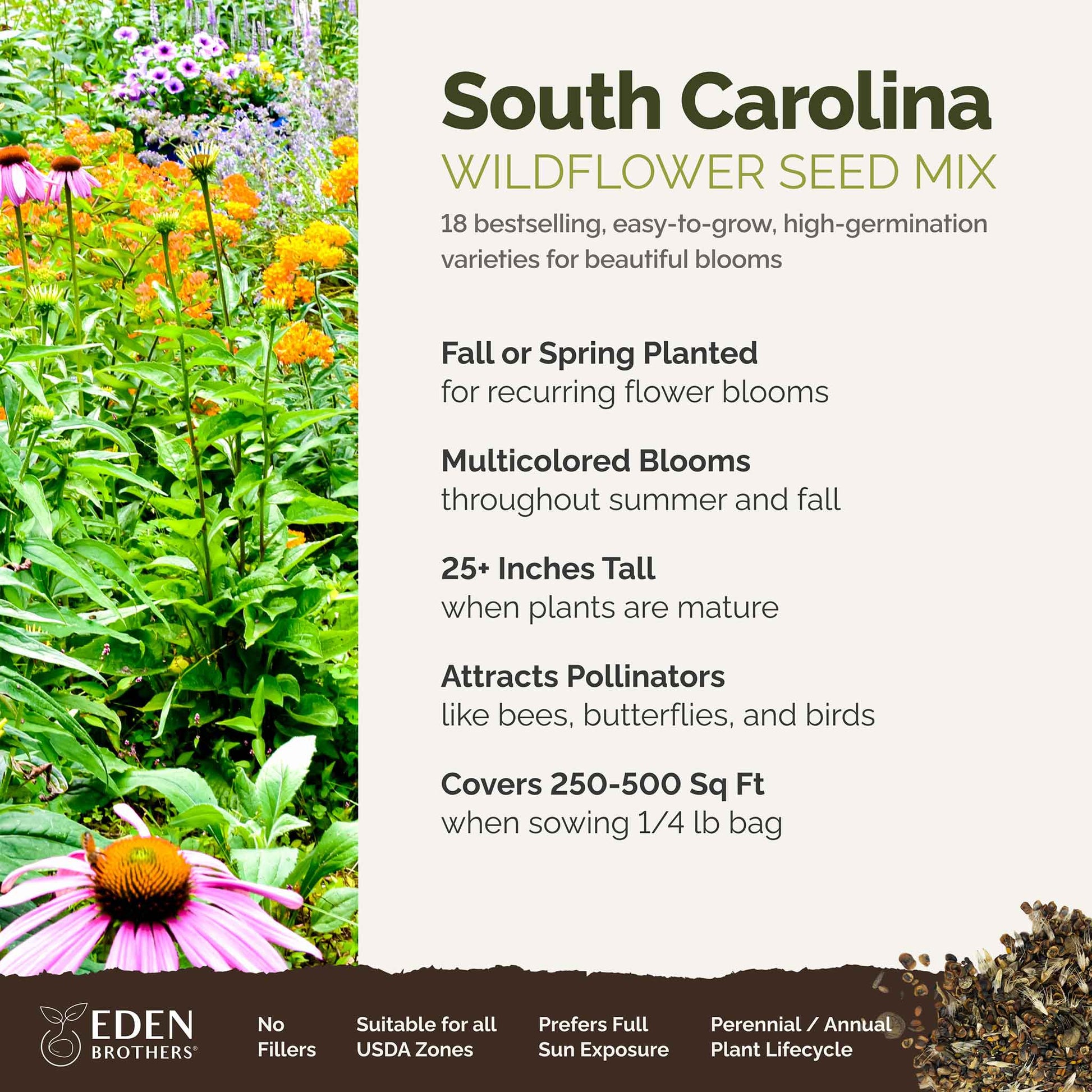South Carolina, with its diverse array of habitats stretching from the Appalachians to the Atlantic, is home to more than 3,100 species of plants including more than 680 species of wildflowers. You’ll find wildflowers blooming along forested paths, on mountainsides, and planted in gardens and landscapes throughout the state. Our South Carolina Wildflower Seed Mix contains 18 varieties to help you and your area become part of The Palmetto State’s wildflower beauty. This mix is 50% annual and 50% perennial, creating that perfect balance of first year color and sustainable blooms for years thereafter.